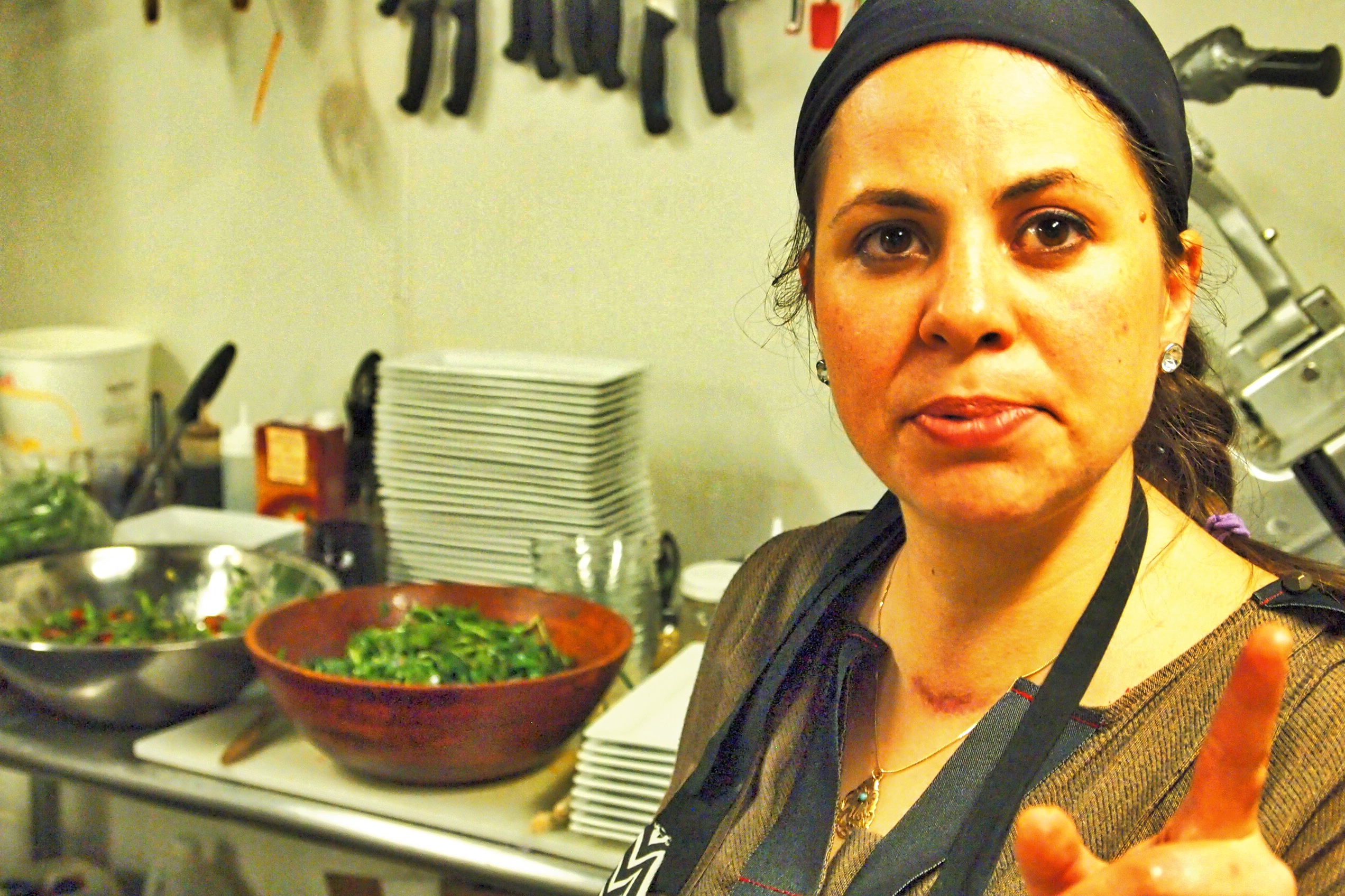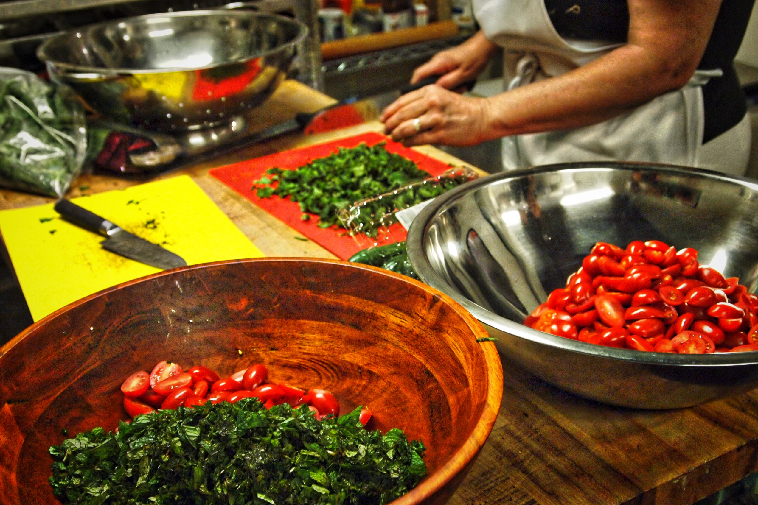 The day of the event I arrived at Caffe Torino at 1 PM. We started the day with Caffe Torino regular and a friend Joanie. We chopped mints, parsley and tomatoes and started the prep work.