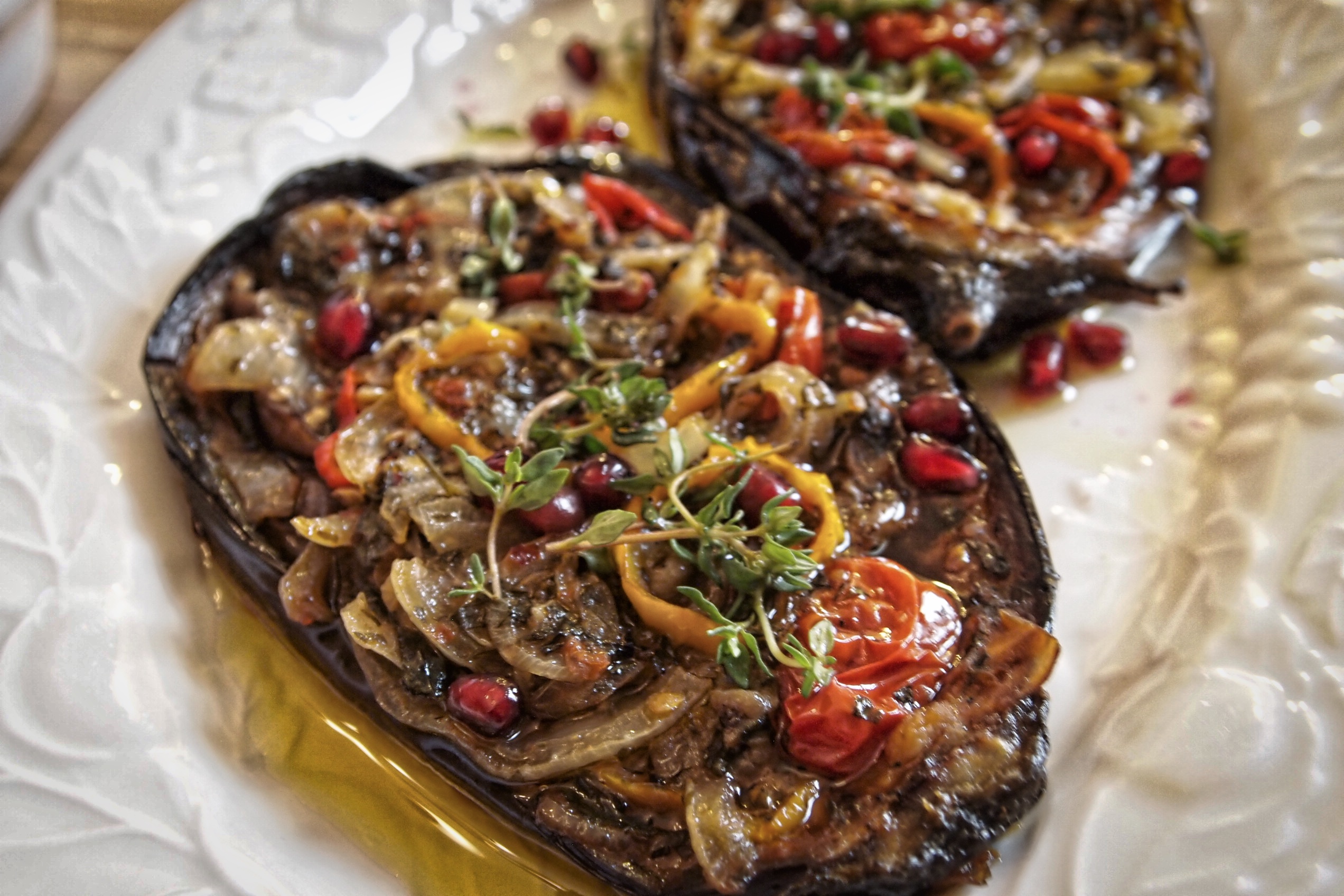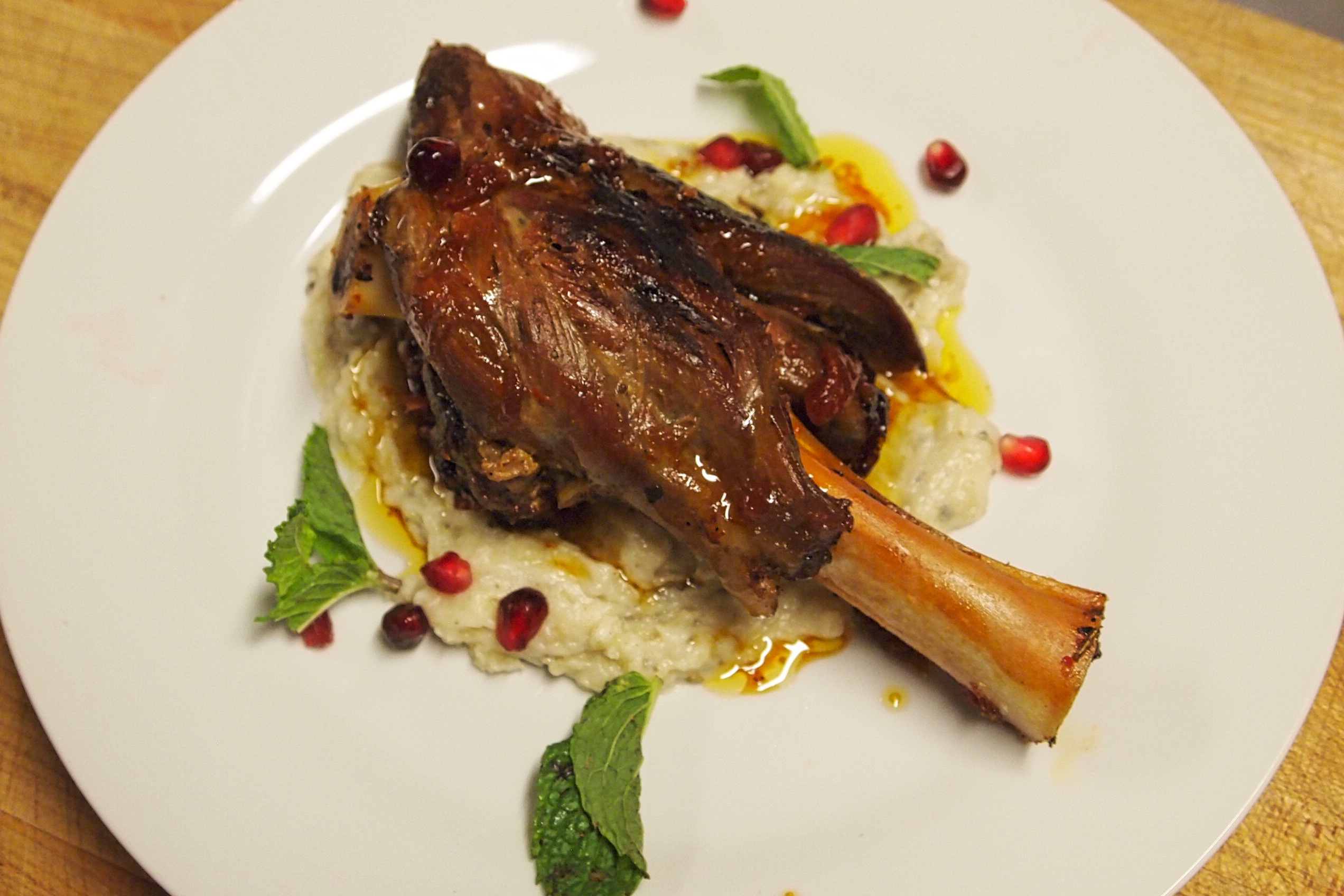 There were two main course options – first one was lamb shanks rubbed with a Turkish honey/spice rub -in a spicy sauce served with hunkar begendi – a cheesy eggplant puree – or if you were vegetarian you got a piece of my rendition of the imam bayildi – the cold eggplant dish filled with onions, tomatoes and peppers.