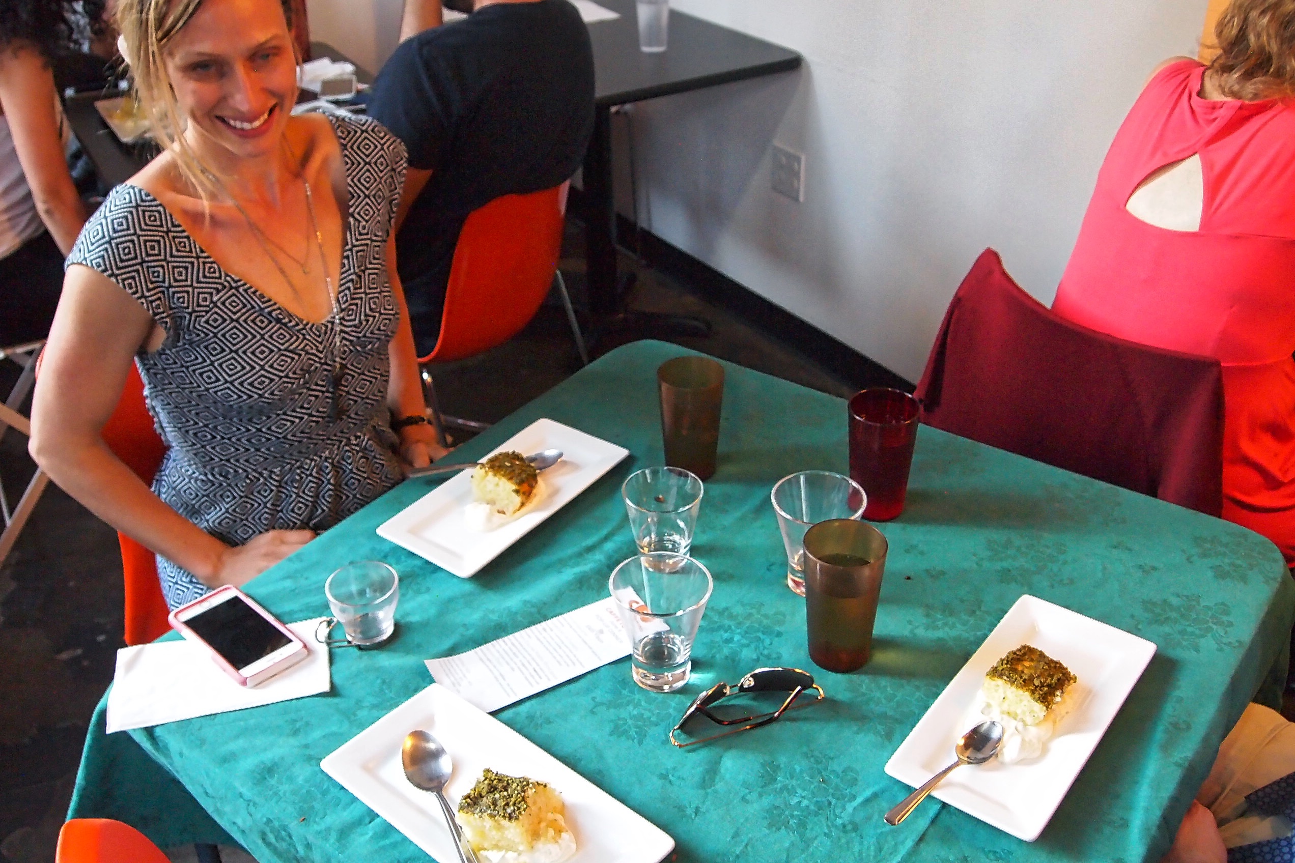 We concluded the meal with a new invention: Revlava- basically it is the fusion of two different deserts: baklava + revani. Revani is a syrup soaked semolina cake – also known as basbousa in the Middle east. The cake is dense and soaks the syrup. Baklava is baklava- the layered pieces of thin dough filled with crushed nuts of different kinds. I slightly modified the revani syrup recipe to mimic a baklava syrup. I topped each piece of revlava with pistachios from Gaziantep. Underneath the desert was honey mascarpone cream. Unfortunately I don’t have a close up of this last bite.
